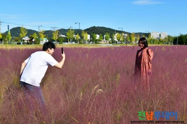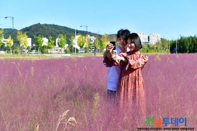지난 10일 담양군 대나무바이오단지(한국대나무박물관 옆)를 찾은 관광객이 활짝 핀 핑크뮬리 사이에서 가을 정취를 만끽하고 있다.