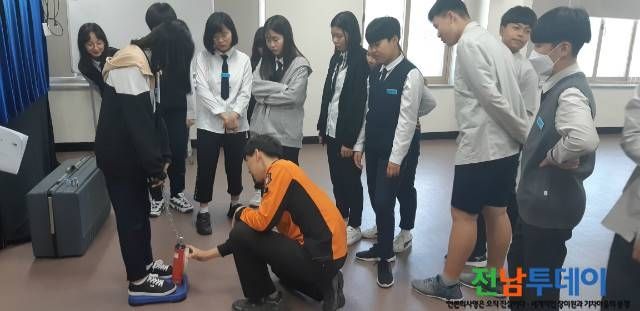 담양소방서(서장 최현경)는 11일 소방서를 찾은 곡성중학교 학생 70여 명을 대상으로 안전의식 향상과 진로 설계 지원을 위한 소방관 진로체험 교육을 실시했다.