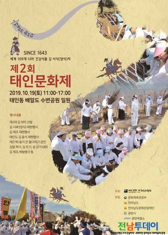 【전남투데이 구정준 기자】광양시 태인동은 태인문화제추진위원회(이하 ‘추진위원회’)가 주최하는 ‘제2회 태인문화제’ 행사를 오는 19일(토) 오전 10시부터 배알도 수변공원 일원에서 개최한다고 밝혔다.