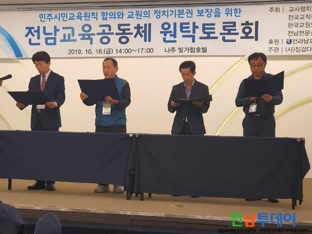 전교조전남지부(지부장 김기중), 한교조전남본부(본부장 박종출), 전상교조(위원장 김우영) 대표들은 18일(금) 오후 나주 빛가람 호텔 대회의실에서 150여 명의 교원, 학부모, 시민들이 참가한 가운데 열린 전남교육공동체 원탁토론회에서 이런 내용의 선언문에 합의했다.