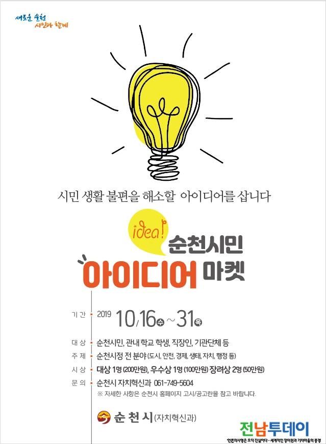 【전남투데이 구정준 기자】순천시에서는 시민을 대상으로 지역현안 해결과 시민 행복정책 아이디어를 발굴하는‘시민 아이디어 마켓’에 반영될 시민들의 아이디어를 10월 31일까지 접수한다.