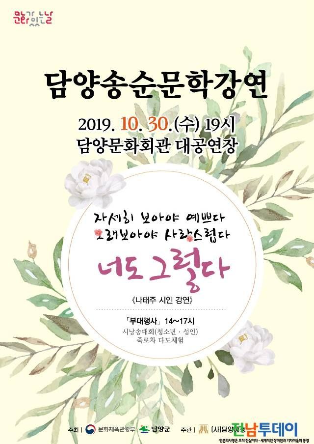 담양군(군수 최형식)이 주최하고 (사)담양예총(회장 송창근)이 주관하는 ‘담양송순 문학제’ 문학 강연이 오는 30일 19시 담양문화회관에서 열린다.