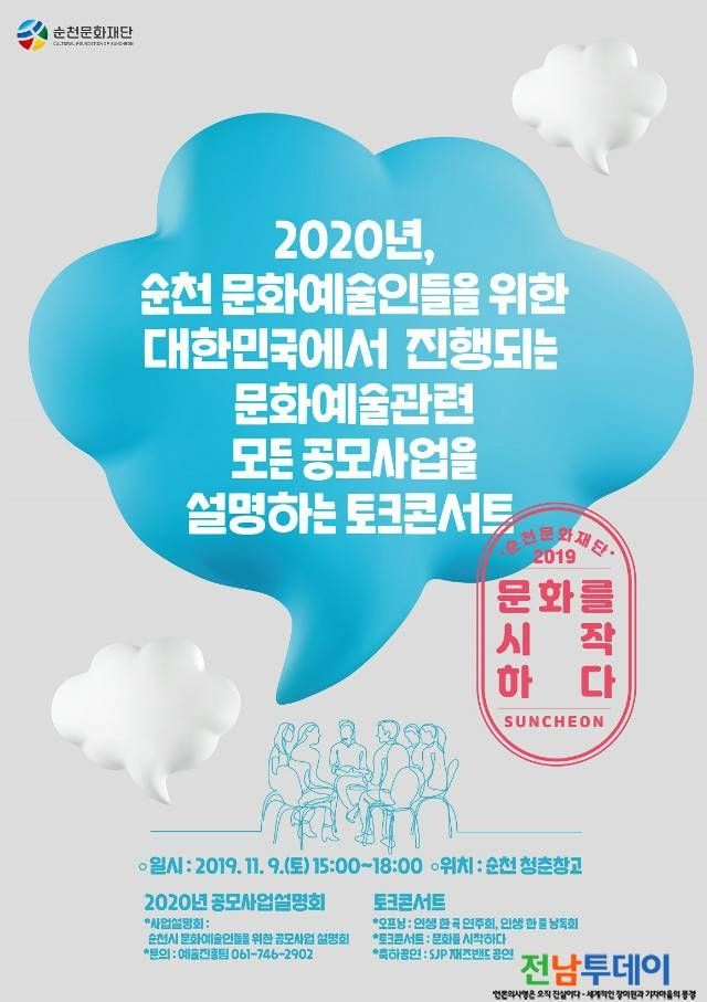 【전남투데이 구정준 기자】순천문화재단(이사장 순천시장 허석)은 오는 11월 9일(토) 오후 3시부터 6시까지 순천 청춘창고에서 토크 콘서트 ‘문화를 시작하다’와 순천문화예술인들을 위한 ‘대한민국 문화예술 공모사업 설명회’를 개최한다.