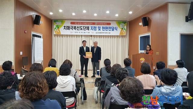 【전남투데이 구정준 기자】순천시는 치매친화적인 문화조성을 위해 (사)희망세상을 치매극복 선도단체로 지정하고 지난 29일(화) 현판 전달식을 가졌다.