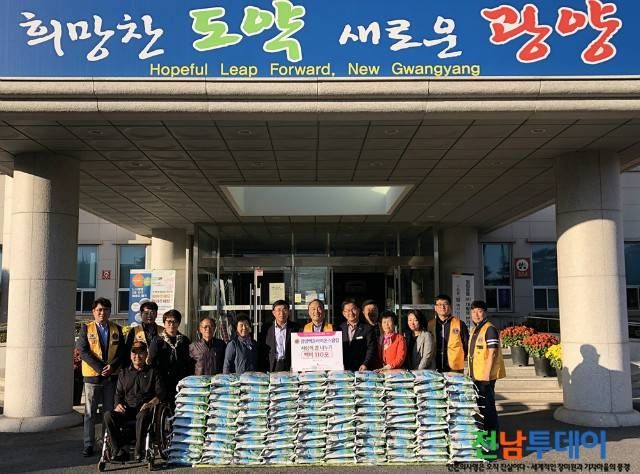 【전남투데이 구정준 기자】광양시 광양읍사무소는 광양백운라이온스클럽(회장 이의형)에서 지난 10월 31일(목) (재)광양시사랑나눔복지재단을 통해 광양읍 취약계층과 사회복지시설·단체에 후원물품 쌀 110포를 기탁했다고 밝혔다.