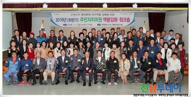 【전남투데이 구정준 기자】광양시는 지난 11월 1일(금) 광양읍사무소 대회의실에서 12개 읍·면·동 주민자치위원 110여 명이 참석한 가운데 ‘2019년 하반기 주민자치위원 역량강화 워크숍’을 개최했다고 밝혔다.