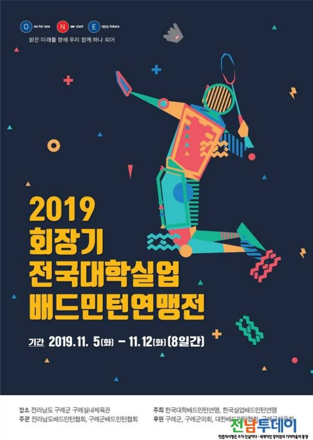 구례군(군수 김순호)은 오는 5일부터 12일까지 8일간 구례실내체육관에서 대학실업 최고의 팀을 가리는 “2019 회장기 전국대학실업 배드민턴 연맹전” 이 열린다고 밝혔다.