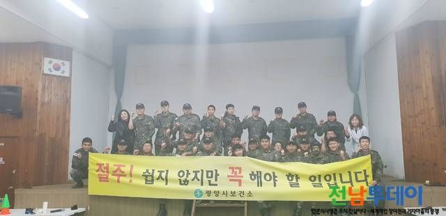 【전남투데이 구정준 기자】광양시보건소는 지난 18일(월) 봉강면 예비군훈련장에서 7391부대 제4대대 군부대장병 50여 명을 대상으로 음주폐해 예방을 위한 절주교육을 실시했다고 밝혔다.