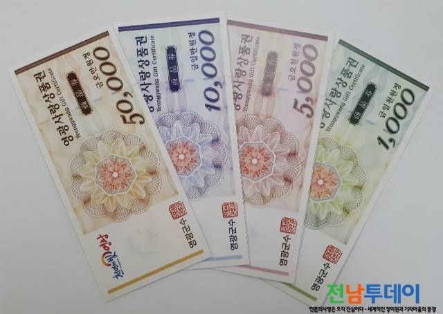 지난 1월 1일부터 발행된 영광사랑상품권은 생활밀착형 가맹점인 전통시장, 주유소, 마트, 음식점, 이·미용업소, 약국 등 1,800여 곳이 가맹점으로 등록되어 있어 사용하기 편리하고 현금처럼 사용할 수 있으며 지류형 상품권의 단점을 보완해 지난 11월 1일 발행된 영광사랑카드는 가맹점과 관계 없이 IC카드 단말기가 설치된 관내 대부분의 업종에서 사용이 가능해 지역경제 활성화의 마중물 역할을 톡톡히 해내고 있다.