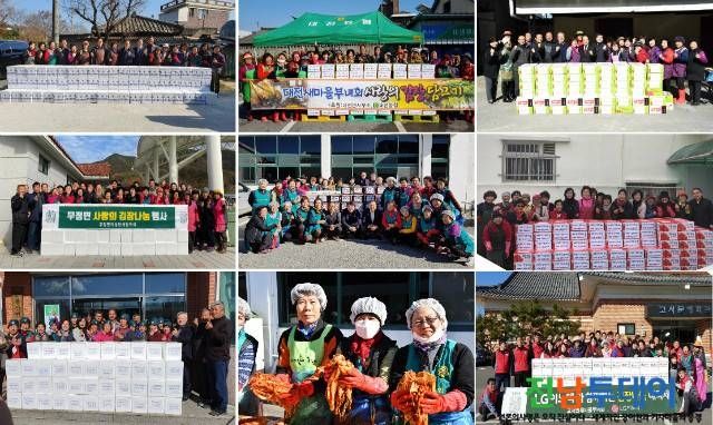 26일에는 무정면 여성단체협의회에서 회원과 무정농협, 주민이 함께 김치를 담가 어려운 이웃 120세대에 전달하며 이웃과 정을 나눴으며 앞선 22일에는 대전면 새마을 부녀회에서 각 마을 부녀회장과 지역 주민 40여 명이 참여해 1000포기의 김장김치를 만들어 취약계층 150여 세대에 전달했다.
