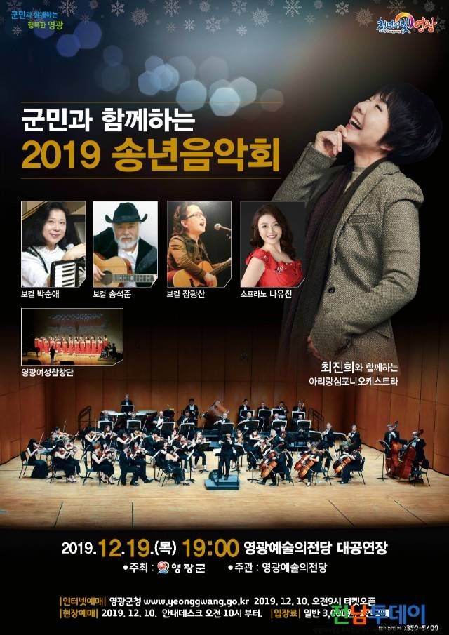 영광군(군수 김준성)은 오는 19일(목) 오후 7시에 영광예술의전당 대공연장에서 ‘2019 송년음악회’를 공연한다.