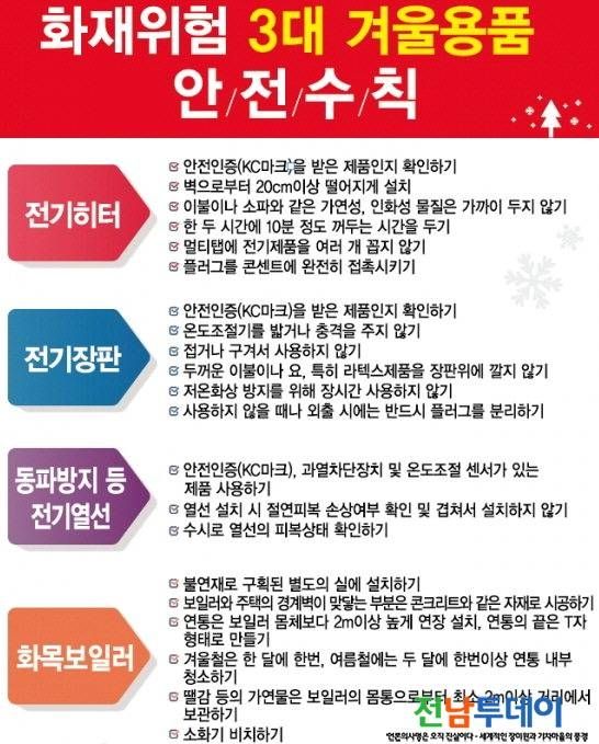 전남 담양소방서(서장 최현경)는 겨울철 화재 예방 3대 겨울용품의 안전수칙을 홍보한다고 밝혔다.