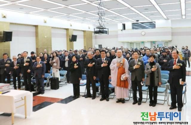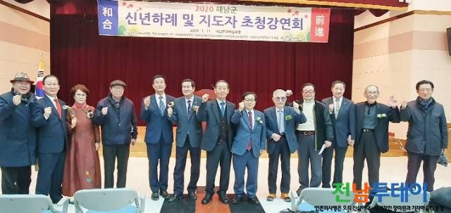 [전남=투데이] 장형문 / 기자 2020년 경자년 새해를 맞이하여 화합과 전진이라는 주제로 평화통일해남군 지도자협의회, (사) 남북통일운동국민연합 해남군 지회, 천주평화연합 해남군 지부, 평화대사협의회 해남군지회, 세계평화여성연합 해남군지회, (사)평화통일단체총연합, 남북청소년교류평화연대 등 단체가 주최하고 (재) 중앙노동경제연구원이 후원하는 ‘2020 해남군 신년하례회 및 지도자초청강연회’가 해남군문화예술회관에서 2020년 1월 11일 오후2시 210명의 지역 지도자와 회원들이 참석한 가운데 성대하게 개최 되었다.