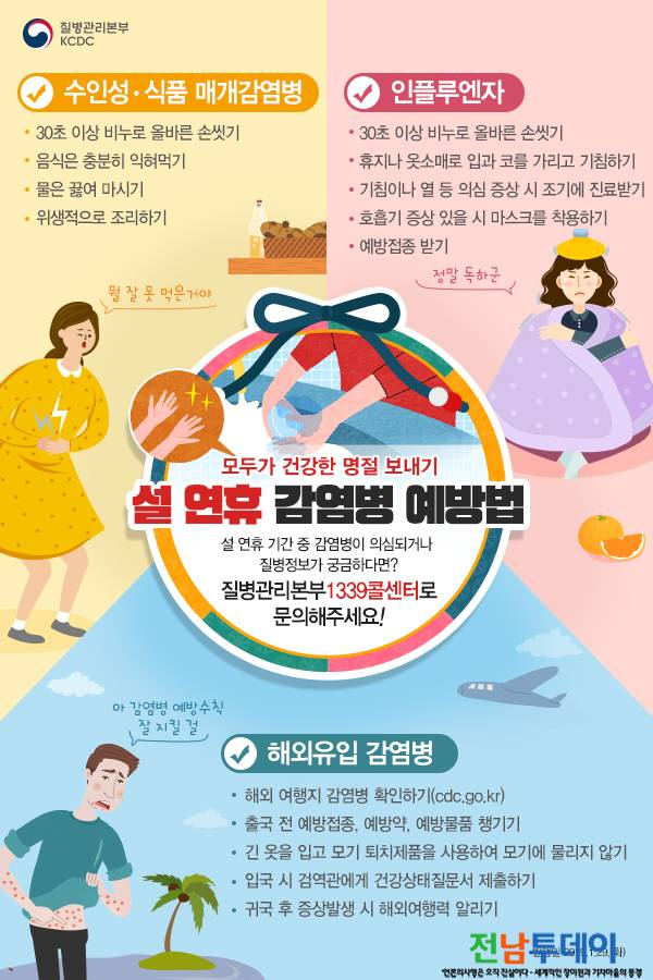 또한, 설 연휴를 맞아 해외여행 시에는 홍역, 세균성이질, 모기 매개 감염병(말라리아, 지카 바이러스 감염증, 뎅기열 등), 메르스 등을 유의해야 한다.