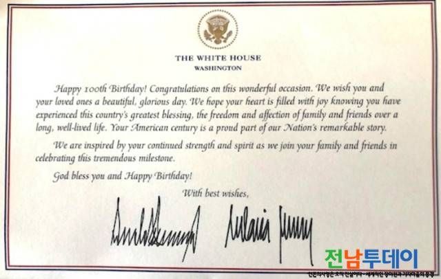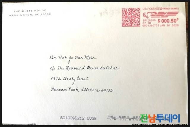 지난 1월 30일자 미국 소인이 찍힌 편지봉투에 담긴 축전문에서 트럼프 대통령 부부는 “문선명 한학자 총재가 활동했던 지난 미국에서의 100년은 참으로 놀라고 자랑스럽다. 한학자 총재의 중단없는 열정에 하나님의 축복이 함께 하기를 기원한다”고 말했다.