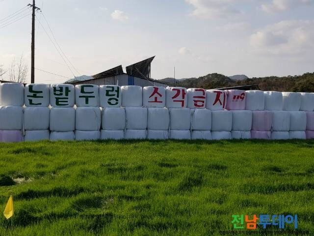 담양군 무정면 오례리 181에 설치된 논밭두렁 소각금지 홍보용 곤포 사일리지">