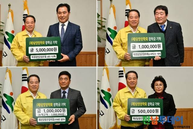 지난해 12월 취임 이후 첫 행사로 고향을 방문한 이성백(무정면 출신)회장이 500만원, 고영택 수석부회장 100만원, 김정우 사무총장 100만원, 최예원 산악회장 50만원 등 총 750만원의 장학금을 (재)담양장학회에 쾌척하며, 고향의 후배들을 위한 밑거름으로 쓰였으면 한다는 바램을 전했다.