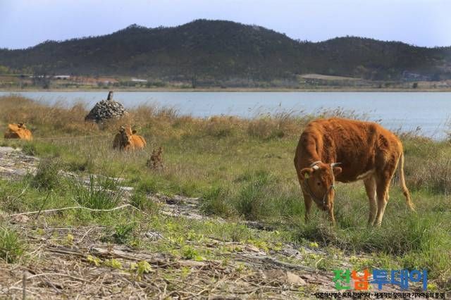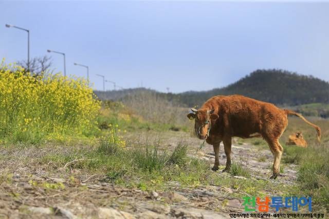 [전남투데이 서지성 기자]따뜻한 봄을 맞아 진도군 군내면 군내호 인근에서 황소가 한가로이 풀을 뜯고 있다.