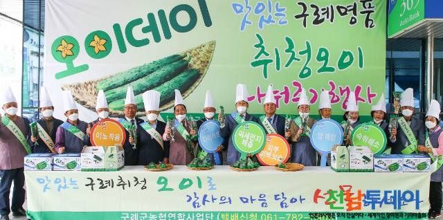 구례오이의 우수성을 널리 알리고, 코로나19로 인한 오이 소비 감소를 극복하기 위한 오이 판촉 및 홍보 행사가 지난 5월 7일 오이 재배 농업인, 주민 등 200여 명이 참석한 가운데 (사)구례군시설원예연합회(회장 전기로)와 구례농협 공동 주관으로 진행되었다.