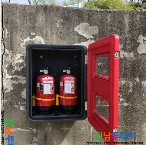 이번에 설치한 소화기함에는 각 2대의 분말 소화기(3.3kg)를 비치했으며 눈에 띄고 언제든 쉽게 사용할 수 있도록 바닥으로부터 1.5m 이하의 높이에 설치되었다.