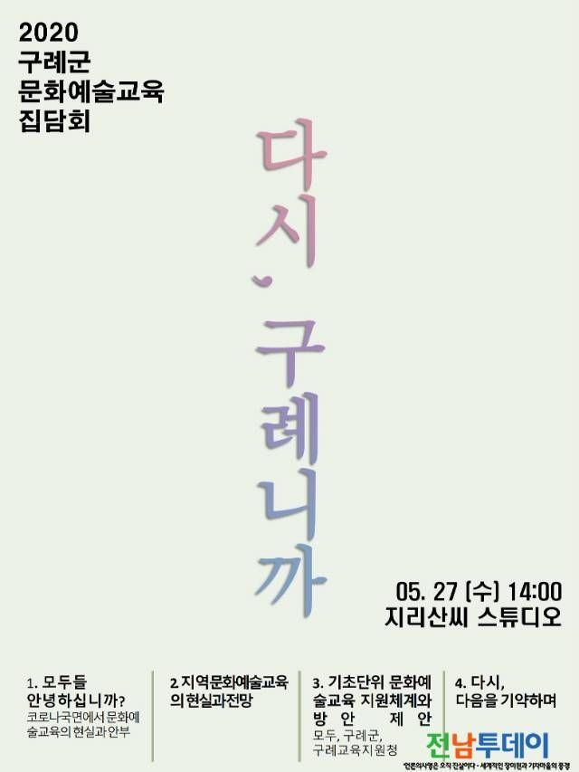 2020년 5월 27일, 전남 구례군 구례읍 지리산씨 스튜디오에서 작년 가을에 이어 두 번째 ‘구례군 문화예술교육 집담회’가 열렸다. 지리산씨협동조합(대표 임현수)이 마련한 자리에 구례에서 활동하는 문화 예술인, 구례교육지원청 및 구례군청 평생교육과 관계자들이 모여 코로나19로 어려운 상황이지만 저마다 체험에서 얻은 의견을 자유롭게 나누고 제언하는 시간이었다.