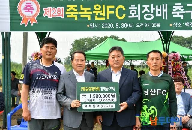 담양군은 지난 30일 백진공원에서 개최된 제2회 죽녹원FC 회장배 축구대회에서 죽녹원 FC(회장 윤재성)가 지역 인재육성을 위한 장학금 150만원을 기탁했다고 밝혔다.