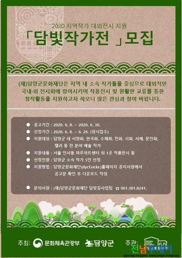 (재)담양군문화재단은 8일부터 오는 26일까지 담양군 소속 지역작가 대외전시 지원 사업‘담빛작가전’에 참여할 작가들을 모집한다고 밝혔다.