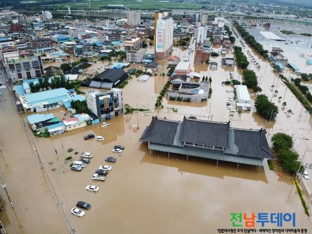 전남 구례군에 이틀 간 380mm의 집중호우로 섬진강·서시천이 범람하며 막대한 피해가 발생하고 있다.