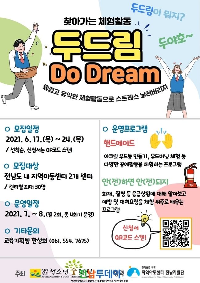 [전남투데이 윤진성 기자]전라남도청소년수련원(원장 강장만)은 찾아가는 체험활동 '두드림 (Do Dream)' 을 운영할 계획이며 오는 6월 24일(목)까지 참여 기관을 모집한다.