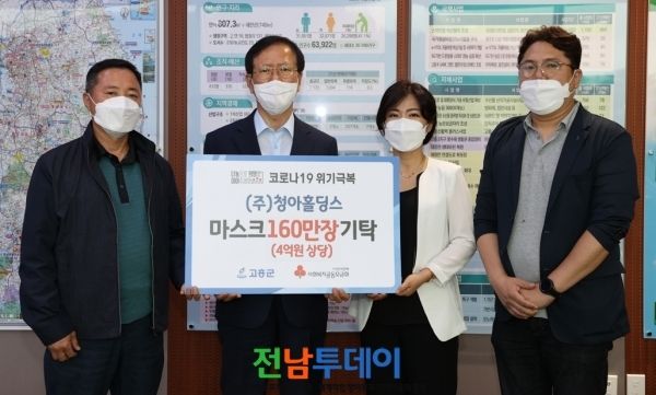 마스크를 기탁한 ㈜청아홀딩스 문규철 공동대표는 “고흥군 노인복지시설에서 2년간 일을 하며 지역의 어려움을 잘 알아 이렇게 기탁을 하게 됐다”며 “앞으로도 지속적인 기부활동을 통해 사회공헌에 앞장 서겠다”고 말했다.