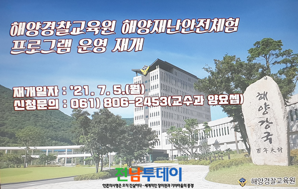 [전남투데이 윤진성 기자]해양경찰교육원(원장 김성종)은 코로나-19 지역사회 확산 방지를 위해 지난해 3월 이후 잠정 중단되었던 ‵해양재난 안전체험 프로그램′운영을 재개한다고 밝혔다.