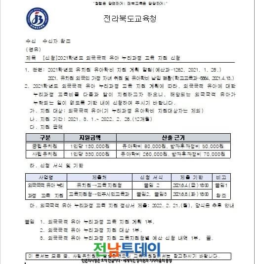 특히 최근 전라북도교육청은 ‘유아의 존엄성과 행복추구권을 보장하여 차별 없는 유아교육 기회를 제공하고 평등한 보육권을 누릴 수 있도록’ ‘외국국적 유아에 대한 학비 전액을 금년 학기부터 선제적 지원한다’고 밝혔으며, 서울시교육청도 이들 유아의 누리과정 학비를 지원해 달라고 정부에 건의한 바 있다.