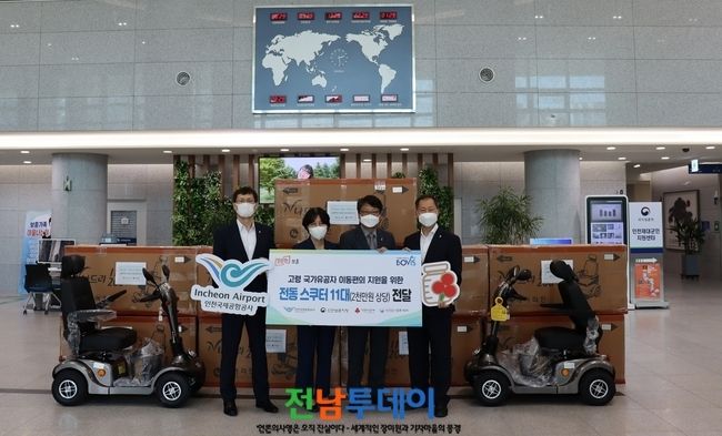 [전남투데이윤진성기자]인천보훈지청(지청장 박현숙)은 6월 28일(월) 인천국제공항공사(사장 김경욱) 후원으로 거동이 불편한 고령 국가유공자 11명에게 전동스쿠터(총 2천만원)를 전달하였다.