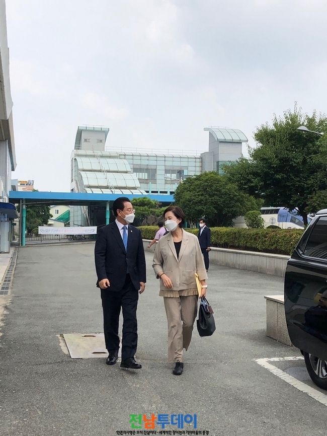 [전남투데이 윤진성 기자]김영록 전남도지사는 2일 ‘그린스마트 미래학교’ 현장 점검을 위해 목포를 찾은 유은혜 부총리 겸 교육부장관을 만나 도청 소재지인 남악·오룡 신도시 내 고등학교 신설 등을 적극 건의했다.