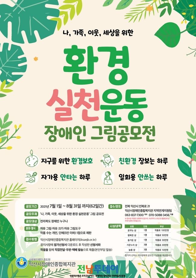 [전남투데이 윤진성 기자]익산시장애인종합복지관(장지환 관장)은 전라북도 도내 장애인에게 문화예술 활동 및 자기계발의 기회를 제공하기 위해 ‘나, 가족, 이웃, 세상을 위한 환경운동’ 그림 공모전을 개최한다.