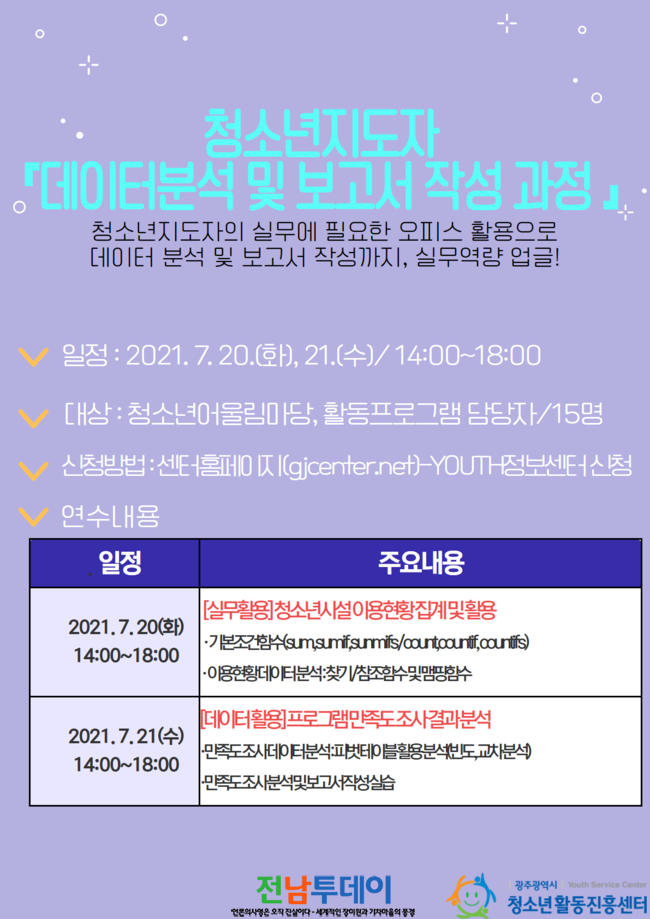 [전남투데이 윤진성 기자]광주광역시청소년활동진흥센터(센터장 문수영)는 청소년수련시설 실무자, 청소년지도자 대상 “데이터분석 및 보고서 작성 과정” 연수를 7월 20일(화) 21일(수) 2회기로 진행한다.