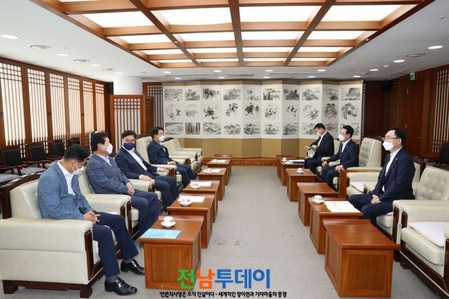 [전남투데이 윤진성 기자]김영록 전라남도지사는 27일 도청을 방문한 조정식, 우원식, 정성호, 주철현 더불어민주당 국회의원과 국가균형발전을 위한 간담회를 하고 유엔기후변화 당사국총회 유치 등 지역 현안에 대해 당 차원의 관심과 지원을 요청했다.