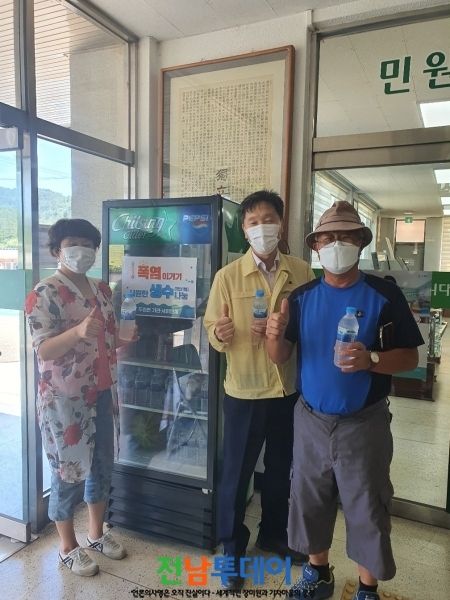 면 청사 출입문 앞에 대형 냉장 쇼케이스를 비치하고 생수는 지역 어르신과 민원인들을 비롯한 내방객들이 자유롭게 1인 1병을 꺼내 마실 수 있다.