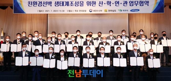 [전남투데이 윤진성 기자]전라남도는 28일 영암 호텔현대에서 해양수산부, 목포시, 선박해양플랜트연구소(KRISO), 현대삼호중공업 등 36개 기관·기업과 ‘친환경선박 생태계 조성을 위한 산학연관 업무협약’을 했다.