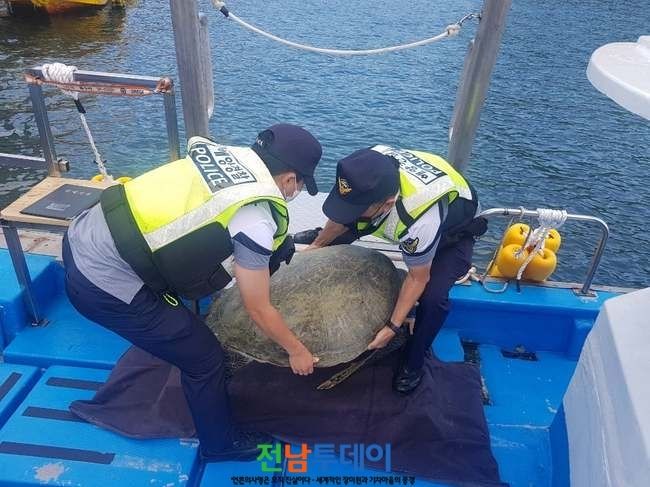 [전남투데이 윤진성 기자]서귀포해양경찰서(서장 황준현)는 어제(18일) 오후 1시 20분쯤 서귀포 성산일출봉 동쪽 해상에 바다거북 사체가 있다는 인근 수중레저업체 직원의 신고를 접수받고 전문가에게 인계 조치했다고 밝혔다.