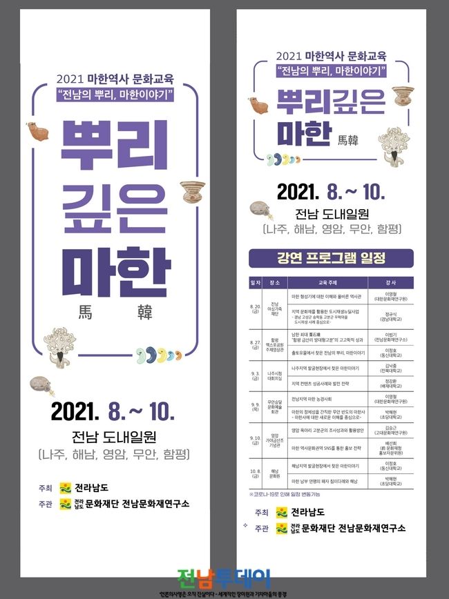 [전남투데이 윤진성 기자]전라남도는 6월 ‘역사문화권 정비 등에 관한 특별법’ 시행에 따라 전남도문화재단 문화재연구소 주관으로 20일부터 10월까지 매주 금요일 도내 일원을 순회하며 지역 맞춤형 마한 역사문화교육 ‘뿌리깊은 마한(馬韓)’을 진행한다고 밝혔다.
