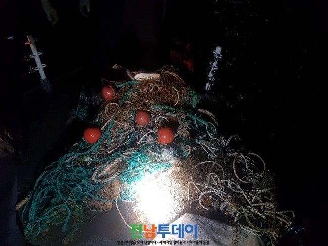 이에 해경은 인근 경비함정을 출동 시켜 현장 확인 결과 폐자망 그물로 추정되는 폐어구 약 200kg을 인양하여 임시보관 후 지자체에 인계예정이다.