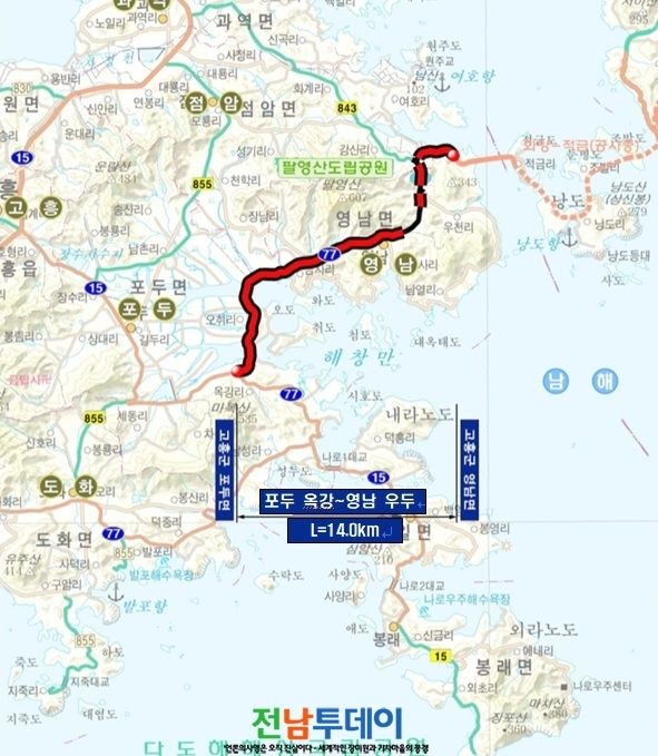 고흥군에 따르면 영남면 우두에서 포두면 옥강에 이르는 총길이 14km의 국도 77호선 도로 개량사업이 최근‘제5차 국도건설 5개년 계획’에 반영됐다고 밝혔다.