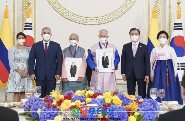 [전남투데이 윤진성 기자]문재인 대통령은 오늘 저녁 개최된 국빈 만찬에서 콜롬비아의 한국전 참전용사인 길예르모 로드리게스 구즈만 옹과 알바로 로사노 차리 옹을 특별 초대했다. 참전용사가 참전국 정상과 함께 방한하여 국빈 만찬에 초대되는 것은 역대 최초다.