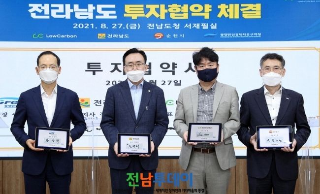 [전남투데이 윤진성 기자]전라남도는 27일 전처리 탈황제 생산업체인 ㈜로우카본과 1천500억 원 규모의 투자협약을 해 탄소중립 사회로의 전환에 보탬이 될 이산화탄소 포집․자원화 시스템을 순천에 구축하기로 했다.