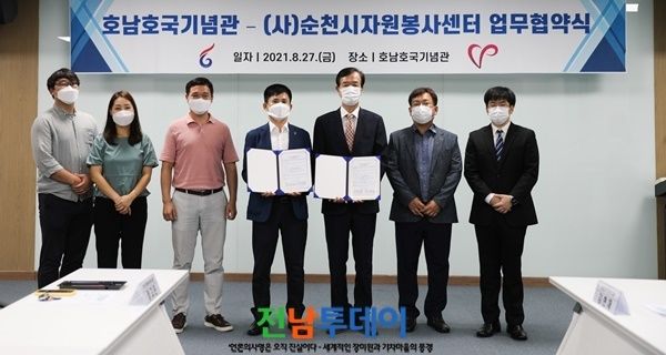 [전남투데이 윤진성 기자]호남호국기념관(관장 이형남)은 (사)순천시자원봉사센터(센터장 문응연)과 8월 27일(금) 14시 호남호국기념관에서 나눔과 봉사를 통한 나라사랑 정신 함양을 위해 상호교류와 협력을 강화해 나가기로 업무협약을 체결하였다.