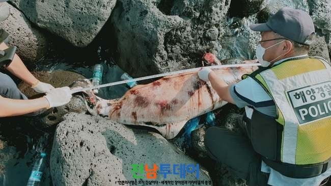 [전남투데이 윤진성 기자]서귀포해양경찰서(서장 황준현)는 어제(29일) 오후 서귀포시 대정읍 해안가에 돌고래 사체가 발견됐다는 신고를 접수받고 사체를 수습해 지자체에 인계했다고 밝혔다.