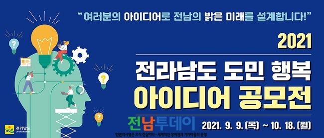 [전남투데이 윤진성 기자]전라남도는 도민과 함께 행복한 으뜸 전남을 설계할 ‘2021 도민 행복 아이디어 공모전’을 개최한다고 밝혔다.