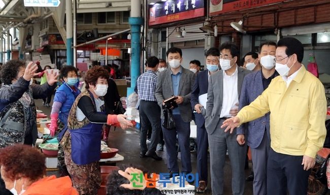 [전남투데이 윤진성 기자]김영록 전라남도지사는 17일 추석을 앞두고 코로나19로 어려운 시장 상인을 격려하고 방역상황을 점검하기 위해 여수 교동시장을 방문했다.