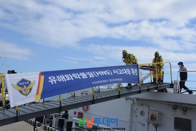 [전남투데이 윤진성 기자]서귀포해양경찰서(서장 황준현)는 오늘(30일) 오후 2시부터 서귀포시 안덕면 화순항 내 해상에서 서귀포해역 유해화학물질 유출사고에 대비한「2021년 위험 유해화학물질 사고 대응훈련」을 실시했다고 밝혔다.